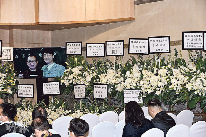 Although the family has expressed their hope that relatives and friends would make donation in lieu of flowers, the entire mourning hall was filled with wreaths, including wreaths from the Hong Kong Police Force, Hui Tao and all colleagues of the Television Broadcasts Limited, Chow Yun Fat and his wife, Andy Lau Tak Wah, Simon Yam Tat Wah, Eric Tsang Chi Wai, Andrew Lau Wai Keung, Wong Jing, Chin Kar Lok and Angela Tong Ying Ying, Miriam Yeung Chin Wah and Real Ting Tsz Ko, Adam Cheng Siu Chau, Fong Ping and Nina Paw Hee Ching, Kent Cheng Juk Si and his wife, Sean Lau Ching Wan and Amy Kwok Oi Ming, Dayo Wong Tze Wah, Sandra Ng Kwan Yu, Gigi Lai Chi, Wilson Lam Chun Kit, Jordan Chan Siu Chun and Cherrie Ing Choi Yee, Patrick Tam Yiu Man, Gallen Lo Ka Leung and his wife, Maggie Siu Mei Lei, Nancy Sit Ka Yin, Marianne Chan Miu Ying, Ron Ng Cheuk Hei and others. Outside the mourning hall a sea of flowers was also formed, with wreaths from Jackie Chan, Louis Koo Tin Lok, Jessica Hester Hsuan (Suen Huen), Cecilia Cheung Pak Chi, Candice Yu On On, Carol Cheng Yui Ling, Daniel Wu (Ng Yin Cho), Raymond Lam Fung, Myolie Wu Hung Yi, Kingdom Yuen King Tan, Ruco Chan Jin Pang and his wife Phoebe Sin Man Yau and others.